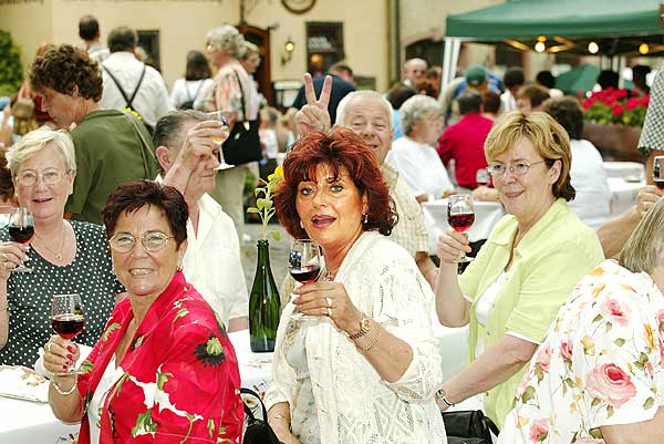 Foto 6: In froher Runde prosten sich Gäste bei der Rotweinprobe und dem Rotweinfest auf dem Marktplatz in am Mittelrhein zu.